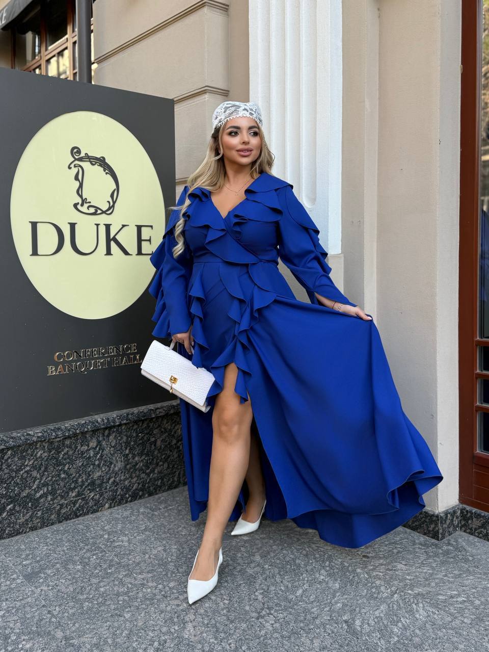 Купить Длинное платье Воланчики с рукавом 8071,3 синий- электрик цвет