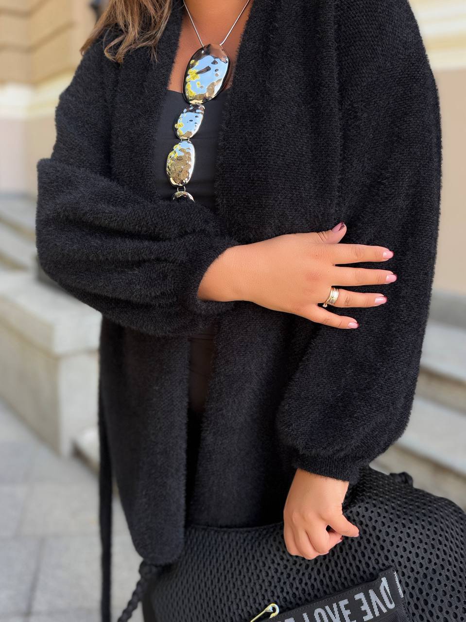 Материал:  вязаный кашемир (шерсть, мохер и акрил) — хорошей плотности, мягкий, приятный к телу, идеальный на осень