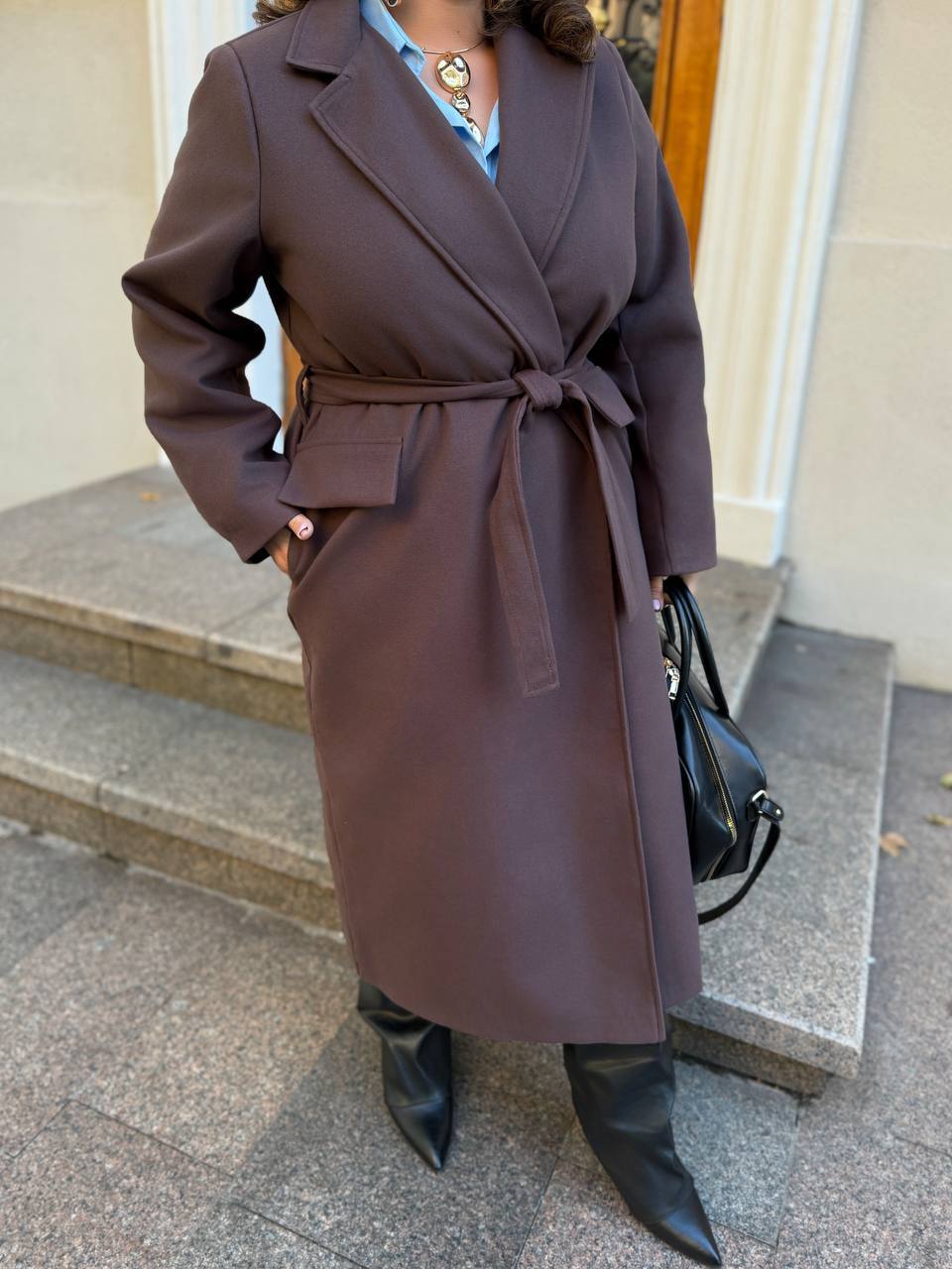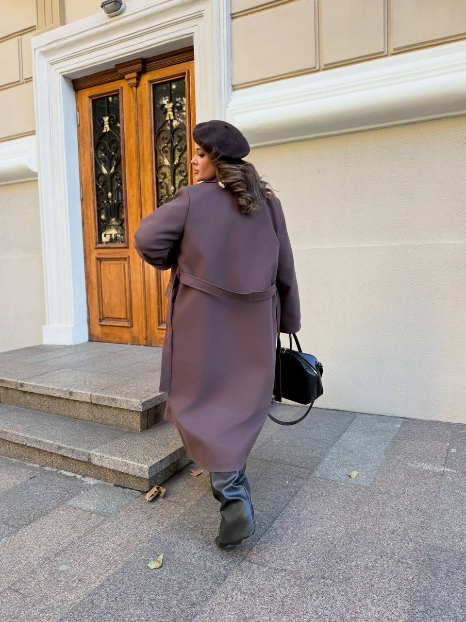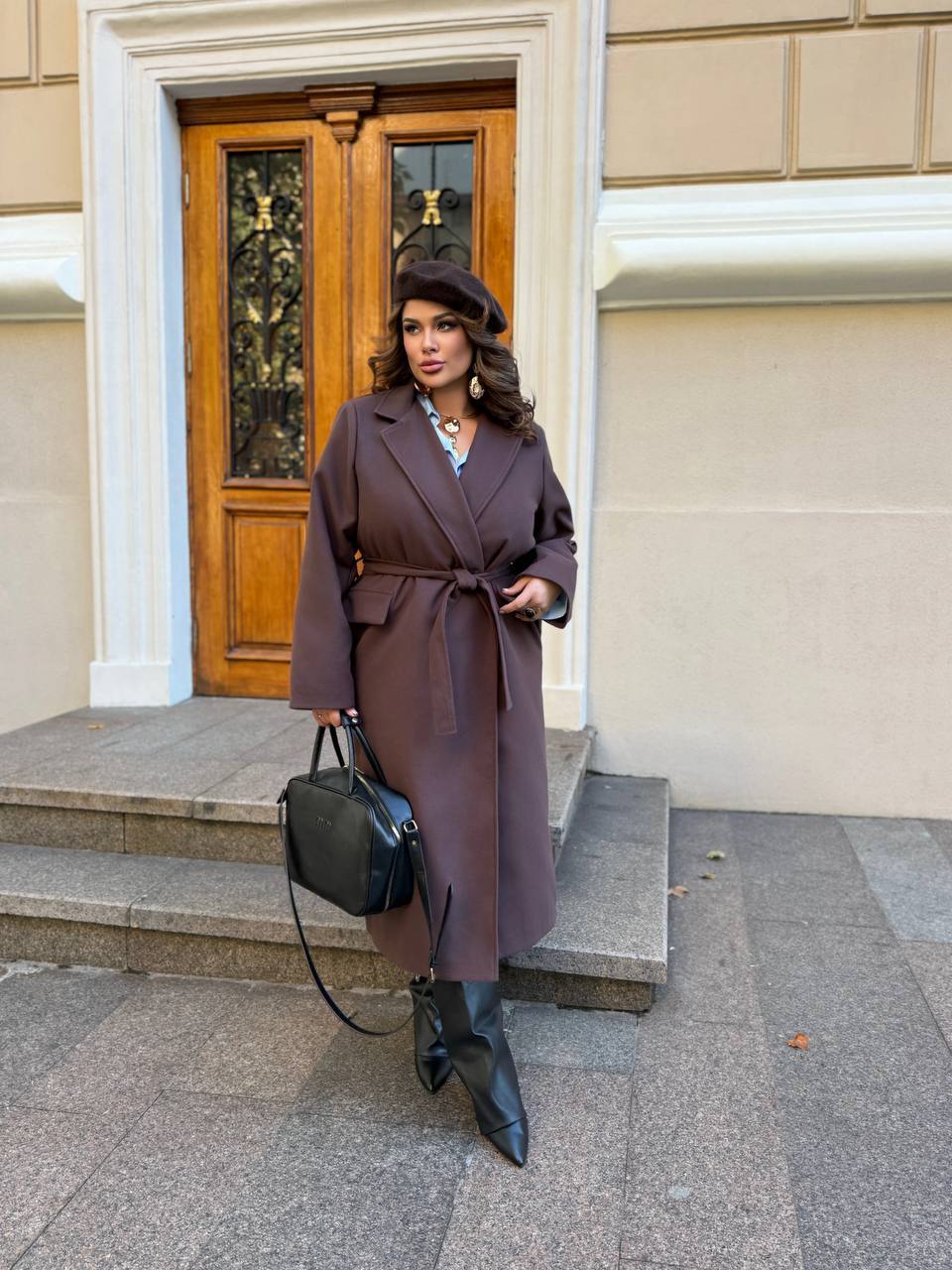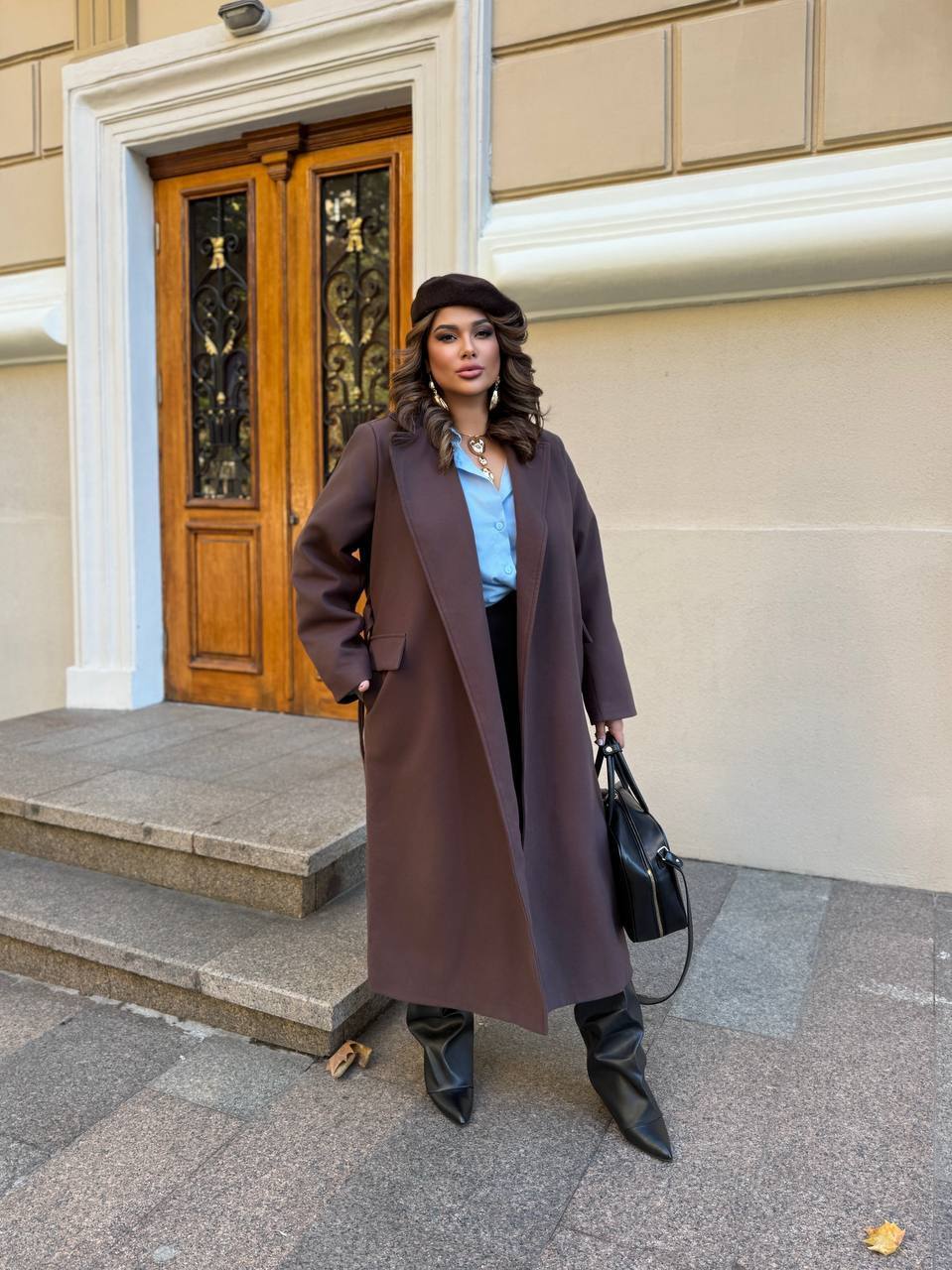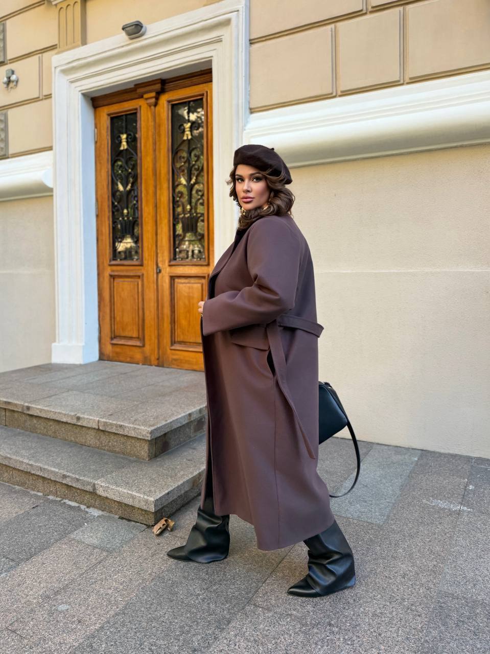 Материал: шерсть 30%, акрил 45%, лавсан 25%. Подкладка стеганая на синтепоне 100. Крой оверсайз, мужской двубортный пиджак (тренд этого сезона). Подплечники вшиты. Застежки – пуговицы, прилагается пояс – можно приталивать, создавая другой стиль образа. Длина изделия 124 см, длина рукава – 63 см.