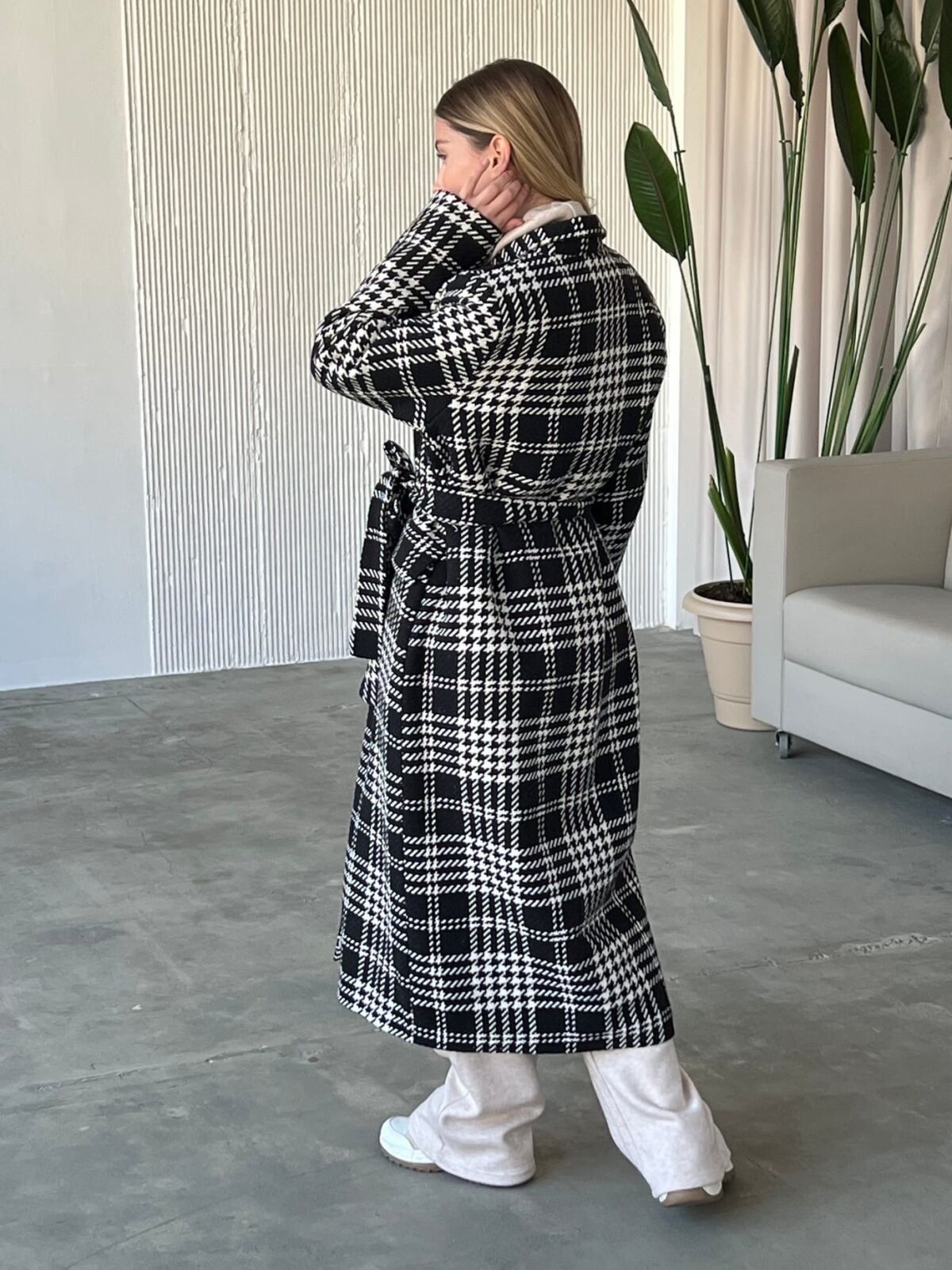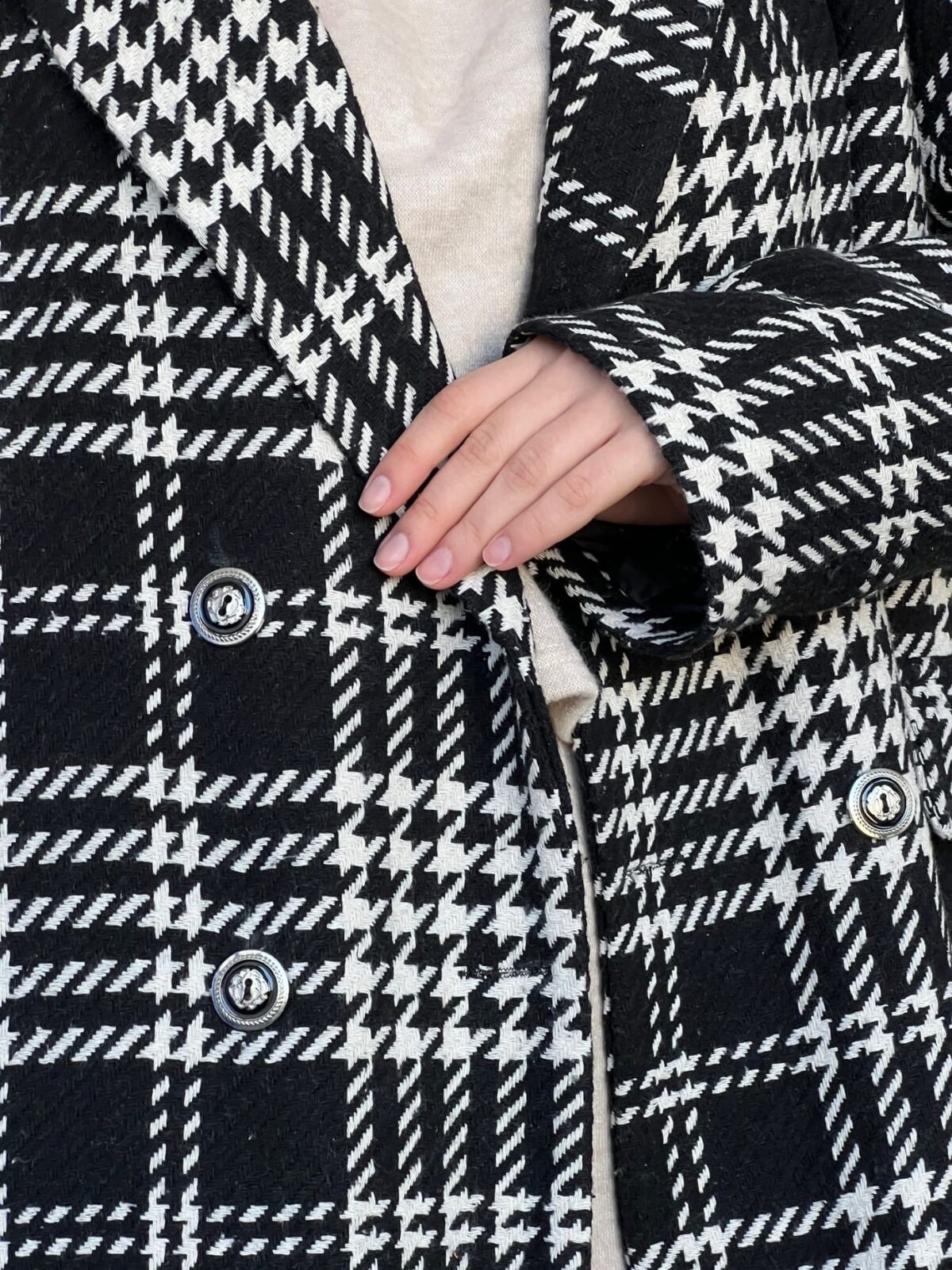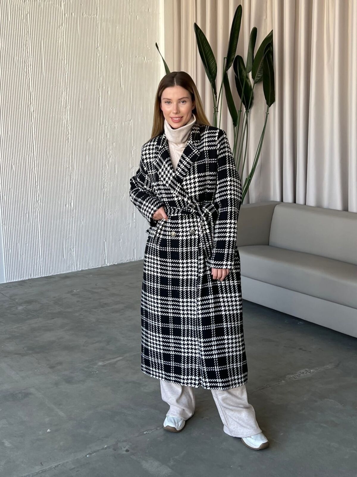 материал: шерсть 30%, акрил 45%, лавсан 25%. Подкладка стеганая на синтепоне 100. Покрой оверсайз, мужской двубортный пиджак (тренд этого сезона). Подплесните вшиты . Застежки - пуговицы, прилагается пояс - можно приталивать, создавая другой стиль образа. Длина изделия 124 см, длина рукава - 63см
