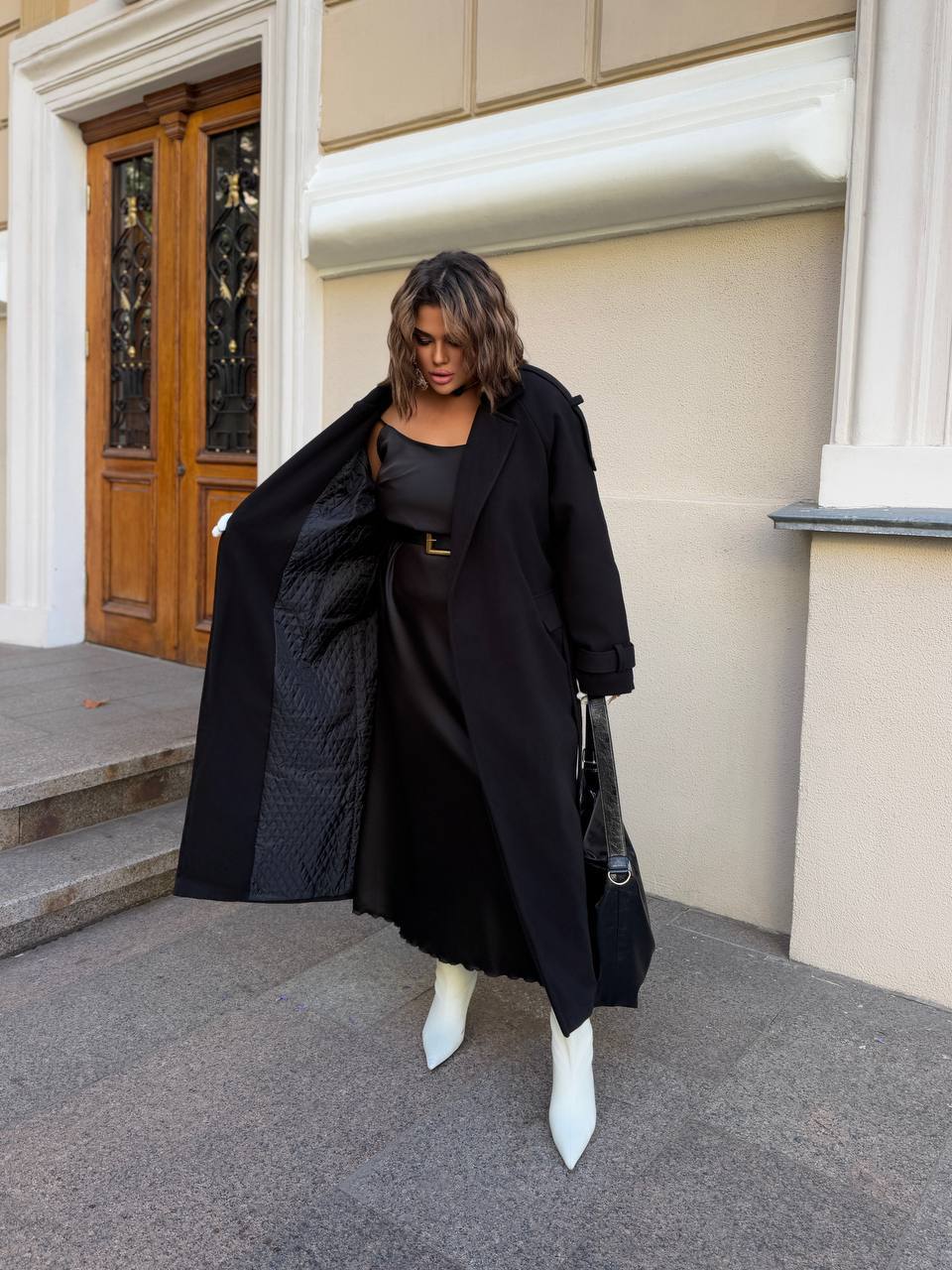 синтепоне 80 плотностей. Два боковых кармана. Одевается на запах, завязывается поясом. Декорировано