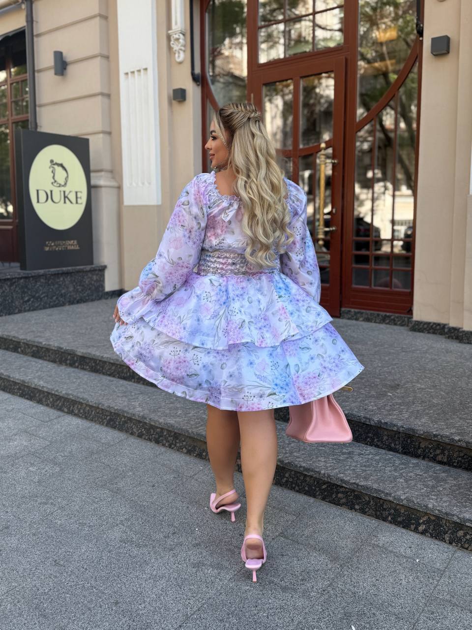 Ткань: органза. Талия на резинке - мягко сидит по фигуре. Длина в 42-46 р - 87 см. 46 см от талии. В 48-52, 54-58 - от талии 50 см. Общая от плеча 90 см. Плечи на резинке тянутся. Поэтому длину точно сказать нельзя. Под грудью есть завязка, которую можно завязать бантиком - будет два образа в одном платье. Закрытое декольте. Или завязать так, чтобы сделать открытое декольте. Идеальная посадка по фигуре. Низ воланов ушит регилином. Что создает необычный образ - тренд этого сезона.