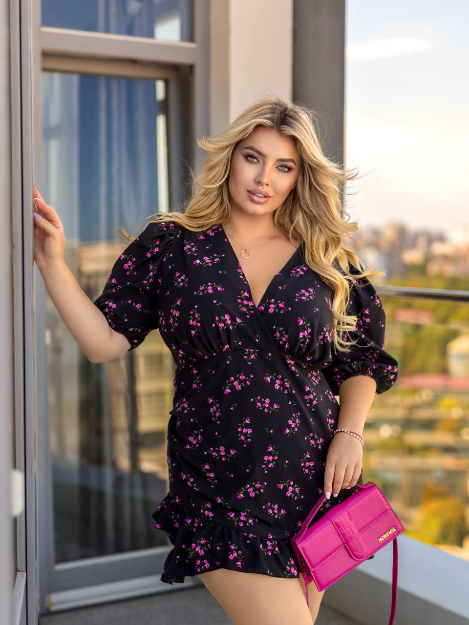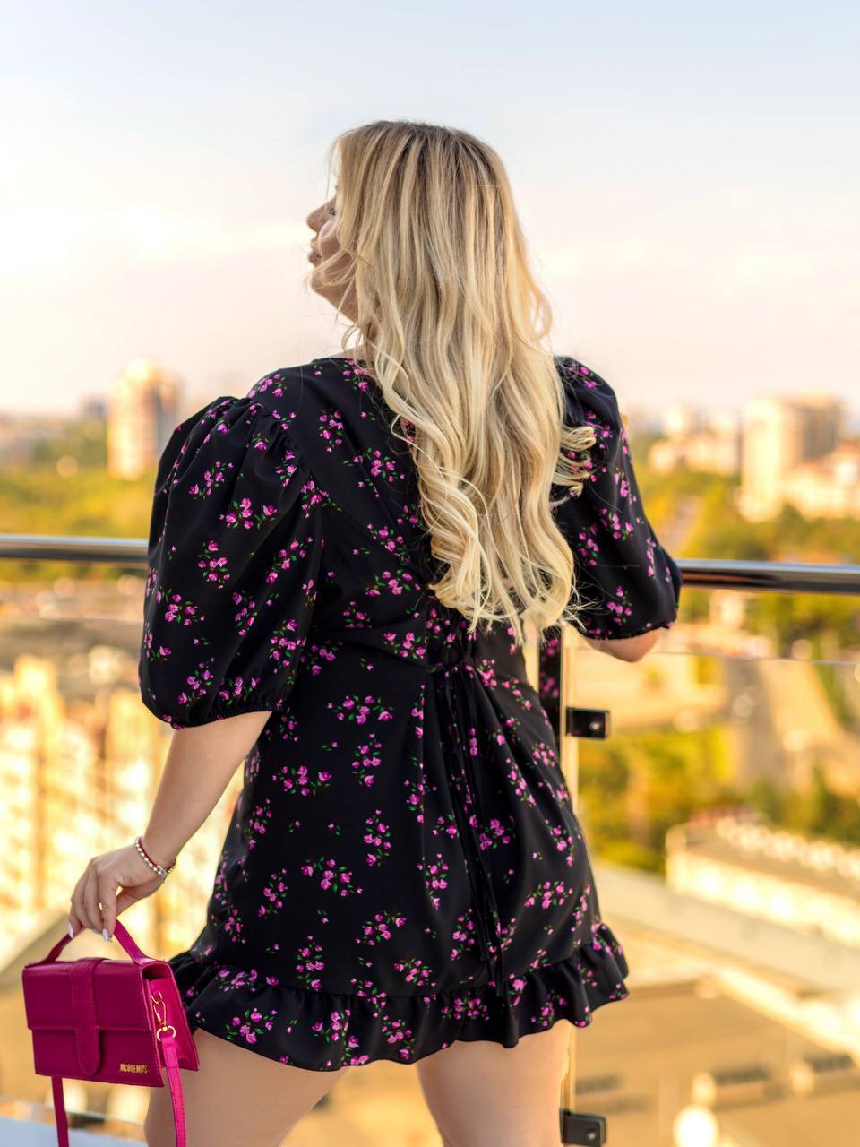 Платье украшено рюшами и объемными рукавами с воздушными подплечниками, сзади шнуруется как корсет - этим регулируется приталенность. Размеры: