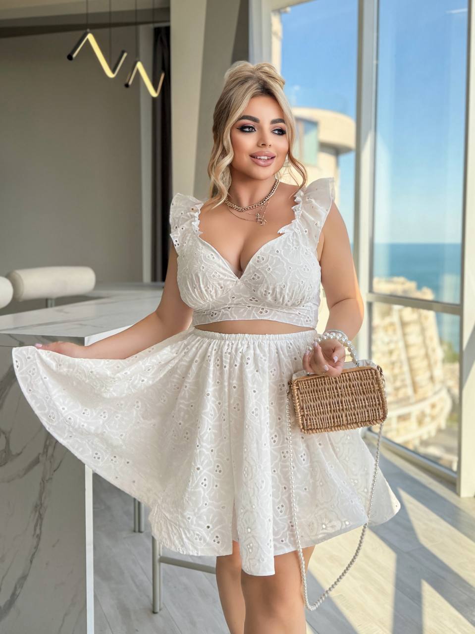 Материал: Хлопок с вышивкой и перфорацией (натуральная, качественная ткань). На подкладке из батиста. Топ сзади завязывается, по плечам резинка. Юбка на резинке, ОС безразмерно. Крой - солнце. Длина в 42-46 р -47 см. В 48-54, 56-62 р - 50 см.