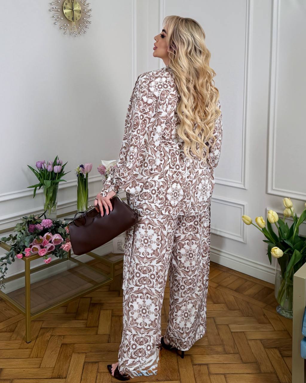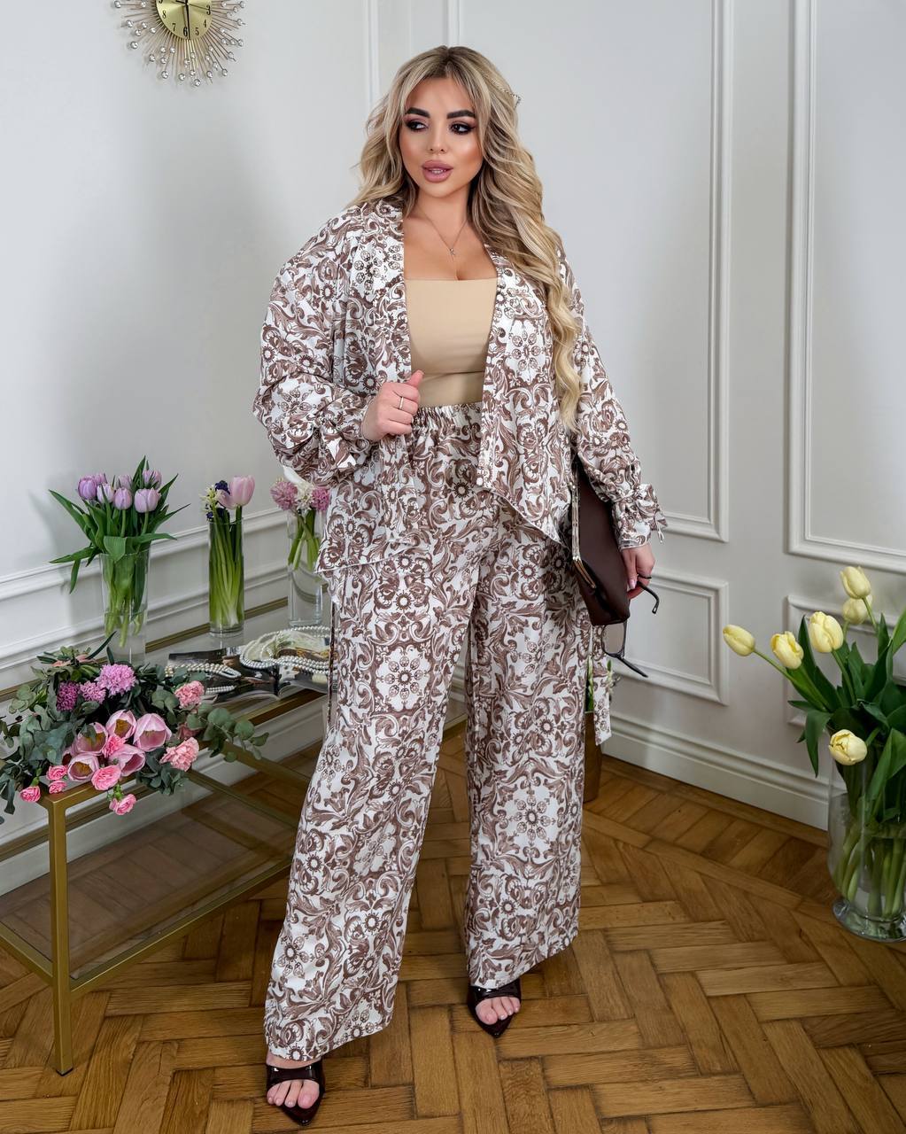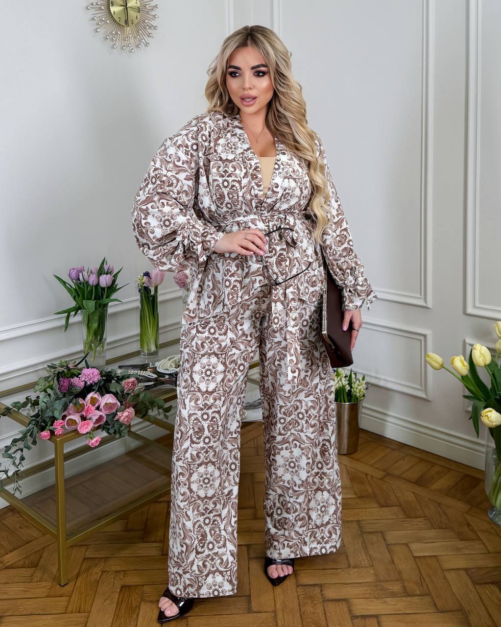 Длина брюк 77/110. Пояс на резинке, высокая посадка. Кардиган одевается на запах, подвязывается поясом. Рукава внизу широкие, есть съемные завязки, которыми можно сделать другую форму рукава завязав их. Замеры по изделию: