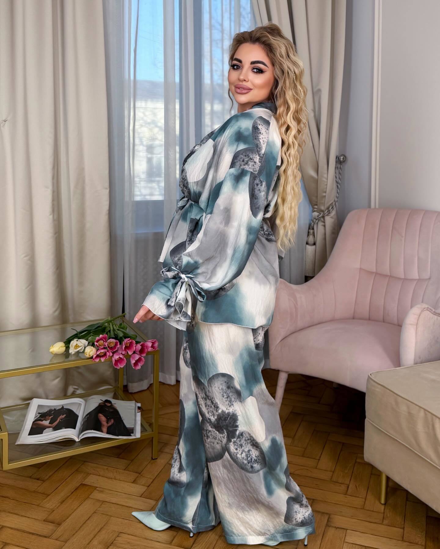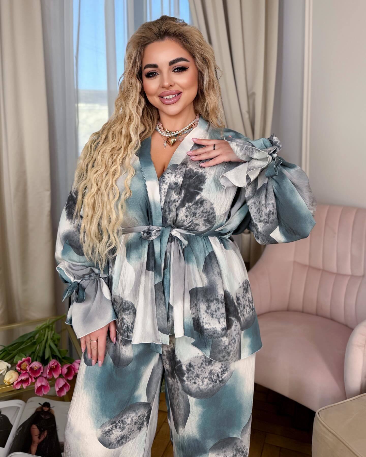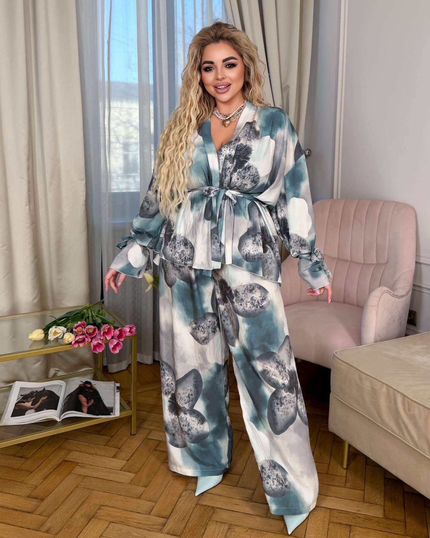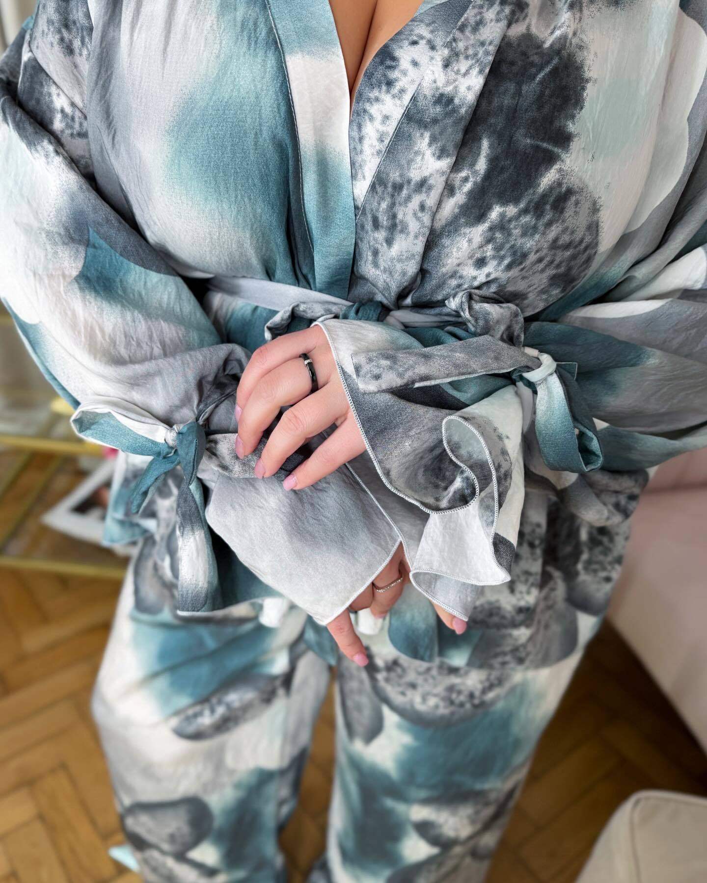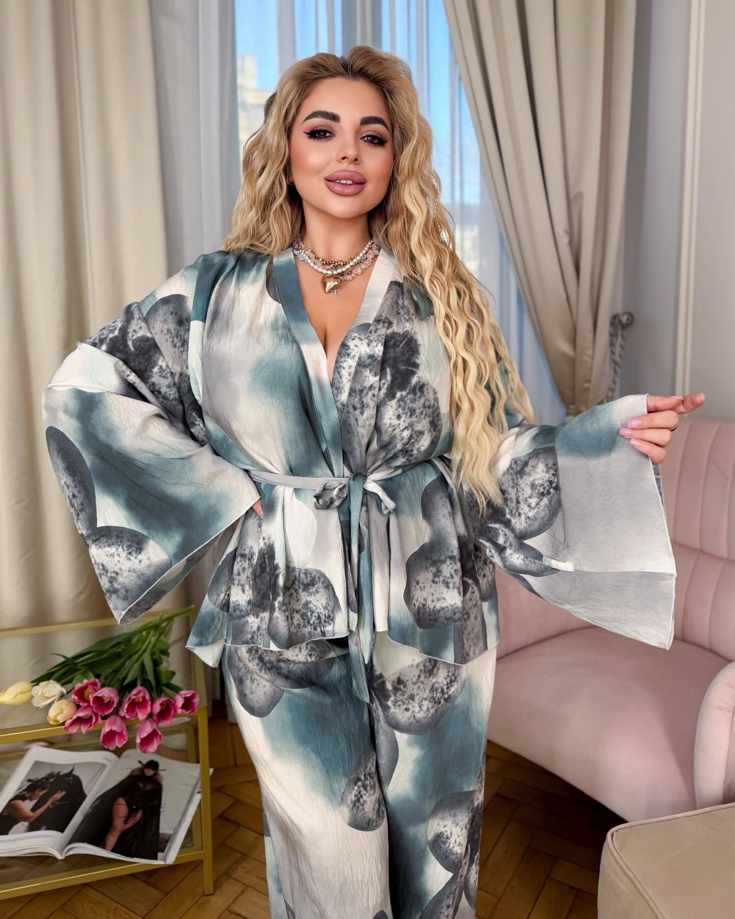 Длина брюк 77/110. Пояс на резинке, высокая посадка. Кардиган одевается на запах, подвязывается поясом. Рукава внизу широкие, есть съемные завязки, которыми можно сделать другую форму рукава завязав их. Замеры по изделию: