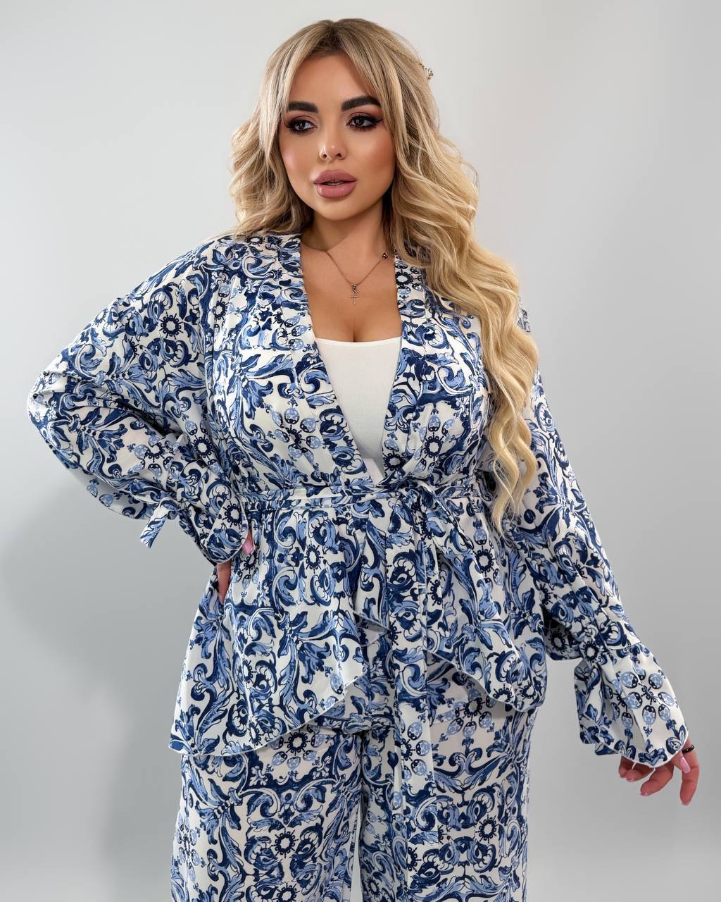 Длина брюк 77/110. Пояс на резинке, высокая посадка. Кардиган одевается на запах, подвязывается поясом. Рукава внизу широкие, есть съемные завязки, которыми можно сделать другую форму рукава завязав их. Замеры по изделию: