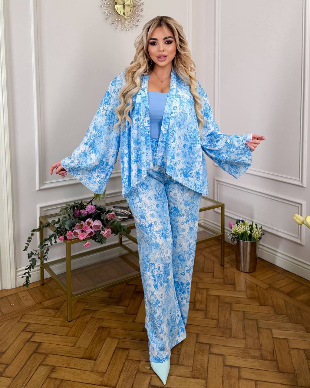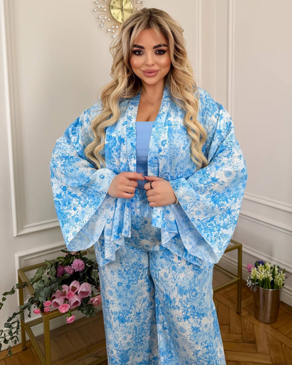 Длина брюк 77/110. Пояс на резинке, высокая посадка. Кардиган одевается на запах, подвязывается поясом. Рукава внизу широкие, есть съемные завязки, которыми можно сделать другую форму рукава завязав их. Замеры по изделию:
