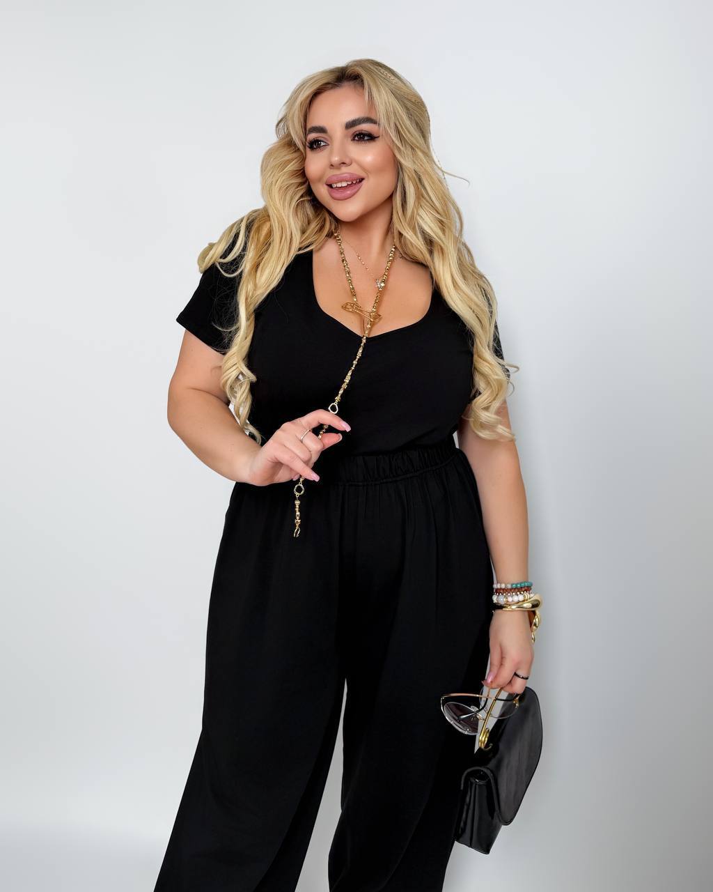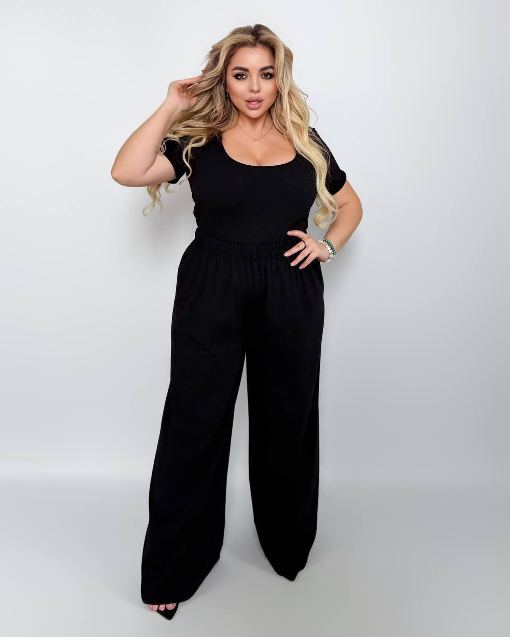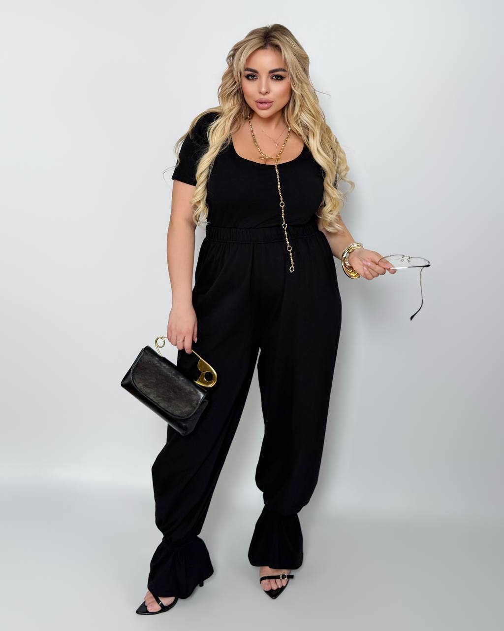 Изюминка костюма: в комплекте две резинки из ткани костюма, которые можно надевать на низ широких брючин и создавать различные образы: брюки Аладина и Палацо. Или завязать хвост на голове.